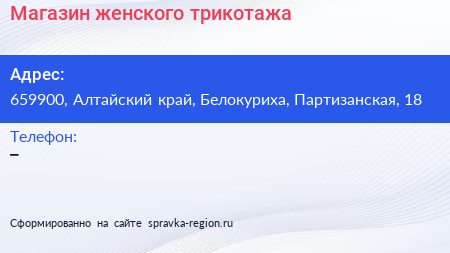 Магазин женского трикотажа по адресу 659900, Алтайский край, Белокуриха, Партизанская, 18 в дальнейшем Организация, размещена в следующих категориях:
