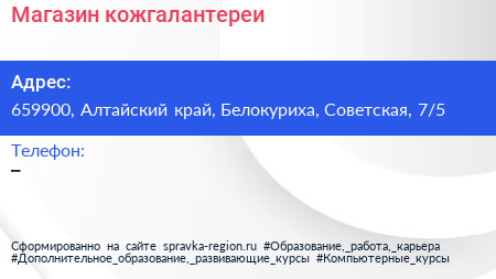 Магазин кожгалантереи по адресу 659900, Алтайский край, Белокуриха, Советская, 7/5 в дальнейшем Организация, размещена в следующих категориях: