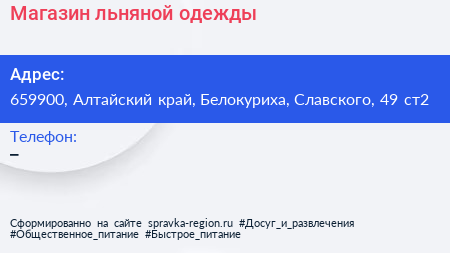 Магазин льняной одежды по адресу 659900, Алтайский край, Белокуриха, Славского, 49 ст2 в дальнейшем Организация, размещена в следующих категориях: