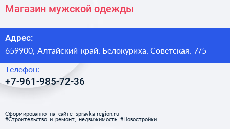Магазин мужской одежды по адресу 659900, Алтайский край, Белокуриха, Советская, 7/5 в дальнейшем Организация, размещена в следующих категориях:
