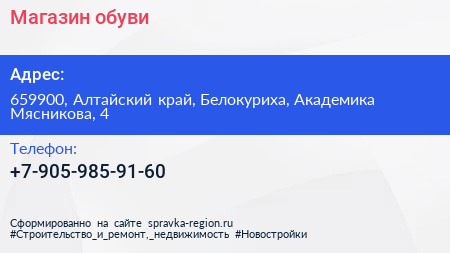 Магазин обуви по адресу 659900, Алтайский край, Белокуриха, Академика Мясникова, 4 в дальнейшем Организация, размещена в следующих категориях: