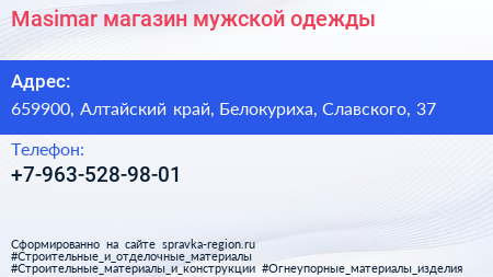 Masimar, магазин мужской одежды по адресу 659900, Алтайский край, Белокуриха, Славского, 37 в дальнейшем Организация, размещена в следующих категориях: