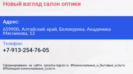 Новый взгляд, салон оптики по адресу 659900, Алтайский край, Белокуриха, Академика Мясникова, 12 в дальнейшем Организация, размещена в следующих категориях: