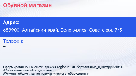Обувной магазин по адресу 659900, Алтайский край, Белокуриха, Советская, 7/5 в дальнейшем Организация, размещена в следующих категориях: