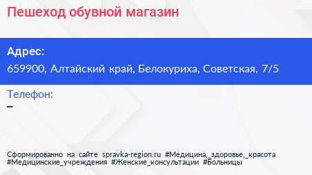 Пешеход, обувной магазин по адресу 659900, Алтайский край, Белокуриха, Советская, 7/5 в дальнейшем Организация, размещена в следующих категориях: