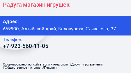 Радуга, магазин игрушек по адресу 659900, Алтайский край, Белокуриха, Славского, 37 в дальнейшем Организация, размещена в следующих категориях:
