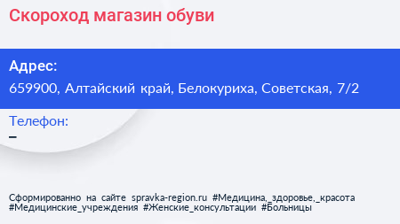 Скороход, магазин обуви по адресу 659900, Алтайский край, Белокуриха, Советская, 7/2 в дальнейшем Организация, размещена в следующих категориях:
