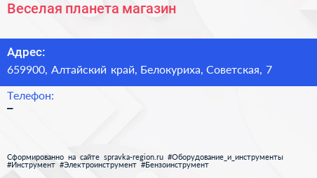 Веселая планета, магазин по адресу 659900, Алтайский край, Белокуриха, Советская, 7 в дальнейшем Организация, размещена в следующих категориях: