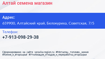 Алтай семена, магазин по адресу 659900, Алтайский край, Белокуриха, Советская, 7/5 в дальнейшем Организация, размещена в следующих категориях: