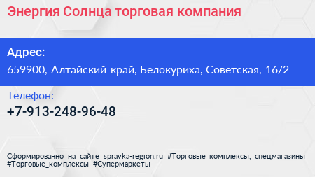 Энергия Солнца, торговая компания по адресу 659900, Алтайский край, Белокуриха, Советская, 16/2 в дальнейшем Организация, размещена в следующих категориях: