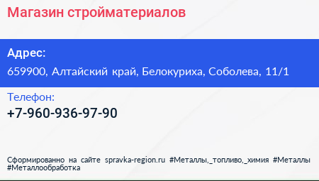 Магазин стройматериалов по адресу 659900, Алтайский край, Белокуриха, Соболева, 11/1 в дальнейшем Организация, размещена в следующих категориях: