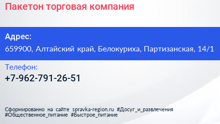 Пакетон, торговая компания по адресу 659900, Алтайский край, Белокуриха, Партизанская, 14/1 в дальнейшем Организация, размещена в следующих категориях: