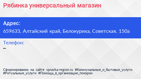 Рябинка, универсальный магазин по адресу 659633, Алтайский край, Белокуриха, Советская, 150а в дальнейшем Организация, размещена в следующих категориях: