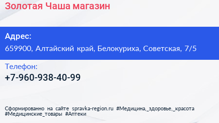 Золотая Чаша, магазин по адресу 659900, Алтайский край, Белокуриха, Советская, 7/5 в дальнейшем Организация, размещена в следующих категориях: