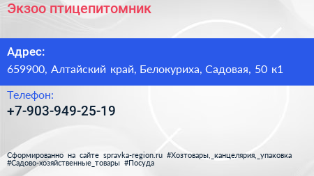 Экзоо, птицепитомник по адресу 659900, Алтайский край, Белокуриха, Садовая, 50 к1 в дальнейшем Организация, размещена в следующих категориях: