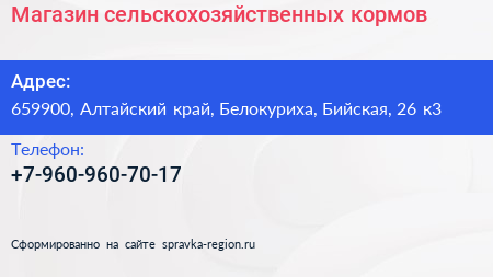 Магазин сельскохозяйственных кормов по адресу 659900, Алтайский край, Белокуриха, Бийская, 26 к3 в дальнейшем Организация, размещена в следующих категориях: