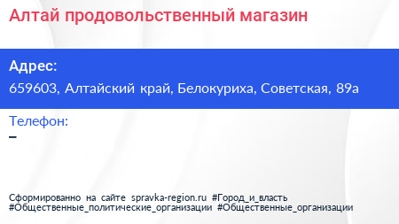 Алтай, продовольственный магазин по адресу 659603, Алтайский край, Белокуриха, Советская, 89а в дальнейшем Организация, размещена в следующих категориях: