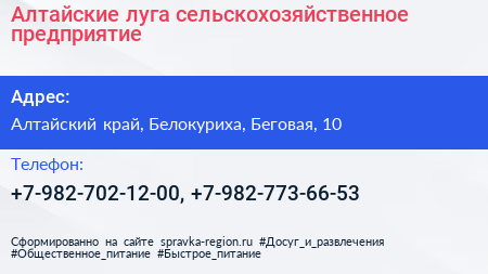 Алтайские луга, сельскохозяйственное предприятие по адресу Алтайский край, Белокуриха, Беговая, 10 в дальнейшем Организация, размещена в следующих категориях: