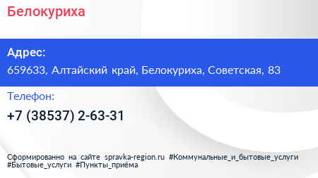 Белокуриха по адресу 659633, Алтайский край, Белокуриха, Советская, 83 в дальнейшем Организация, размещена в следующих категориях: