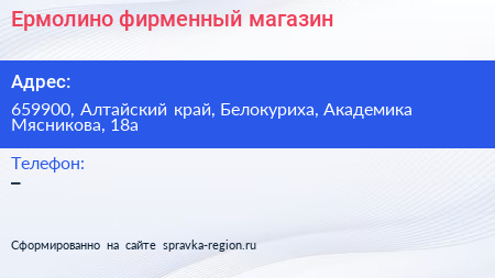 Ермолино, фирменный магазин по адресу 659900, Алтайский край, Белокуриха, Академика Мясникова, 18а в дальнейшем Организация, размещена в следующих категориях: