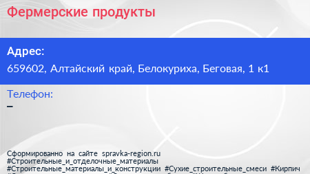 Фермерские продукты по адресу 659602, Алтайский край, Белокуриха, Беговая, 1 к1 в дальнейшем Организация, размещена в следующих категориях: