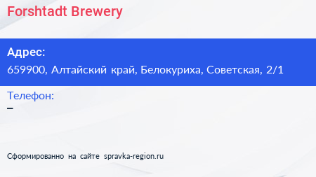 Forshtadt Brewery по адресу 659900, Алтайский край, Белокуриха, Советская, 2/1 в дальнейшем Организация, размещена в следующих категориях: