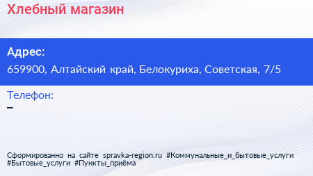 Хлебный, магазин по адресу 659900, Алтайский край, Белокуриха, Советская, 7/5 в дальнейшем Организация, размещена в следующих категориях: