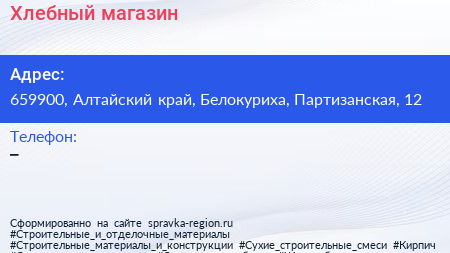 Хлебный, магазин по адресу 659900, Алтайский край, Белокуриха, Партизанская, 12 в дальнейшем Организация, размещена в следующих категориях:
