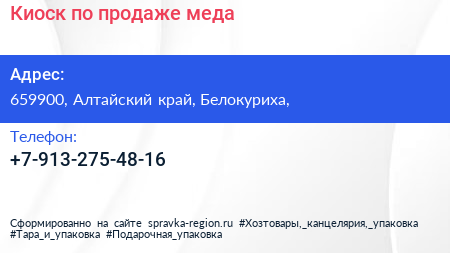 Киоск по продаже меда по адресу 659900, Алтайский край, Белокуриха, в дальнейшем Организация, размещена в следующих категориях: