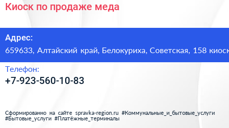 Киоск по продаже меда по адресу 659633, Алтайский край, Белокуриха, Советская, 158 киоск в дальнейшем Организация, размещена в следующих категориях: