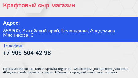 Крафтовый сыр, магазин по адресу 659900, Алтайский край, Белокуриха, Академика Мясникова, 3 в дальнейшем Организация, размещена в следующих категориях: