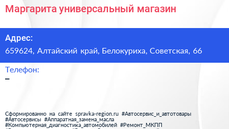 Маргарита, универсальный магазин по адресу 659624, Алтайский край, Белокуриха, Советская, 66 в дальнейшем Организация, размещена в следующих категориях: