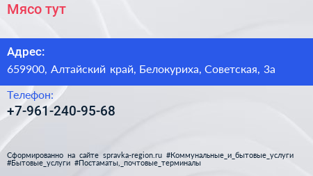 Мясо тут по адресу 659900, Алтайский край, Белокуриха, Советская, 3а в дальнейшем Организация, размещена в следующих категориях: