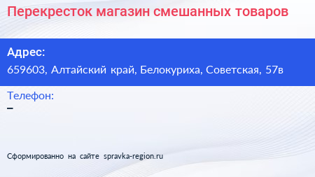 Перекресток, магазин смешанных товаров по адресу 659603, Алтайский край, Белокуриха, Советская, 57в в дальнейшем Организация, размещена в следующих категориях: