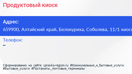 Продуктовый киоск по адресу 659900, Алтайский край, Белокуриха, Соболева, 11/1 киоск в дальнейшем Организация, размещена в следующих категориях: