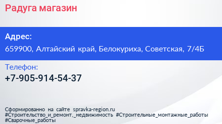 Радуга, магазин по адресу 659900, Алтайский край, Белокуриха, Советская, 7/4Б в дальнейшем Организация, размещена в следующих категориях: