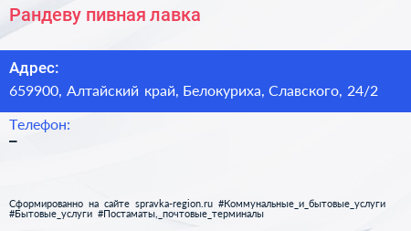 Рандеву, пивная лавка по адресу 659900, Алтайский край, Белокуриха, Славского, 24/2 в дальнейшем Организация, размещена в следующих категориях: