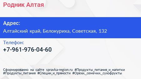 Родник Алтая по адресу Алтайский край, Белокуриха, Советская, 132 в дальнейшем Организация, размещена в следующих категориях: