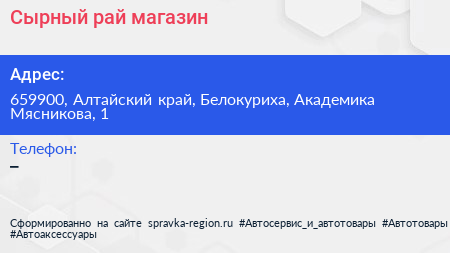 Сырный рай, магазин по адресу 659900, Алтайский край, Белокуриха, Академика Мясникова, 1 в дальнейшем Организация, размещена в следующих категориях: