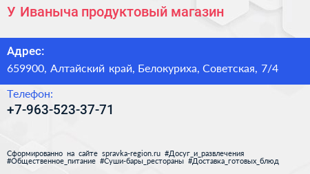 У Иваныча, продуктовый магазин по адресу 659900, Алтайский край, Белокуриха, Советская, 7/4 в дальнейшем Организация, размещена в следующих категориях: