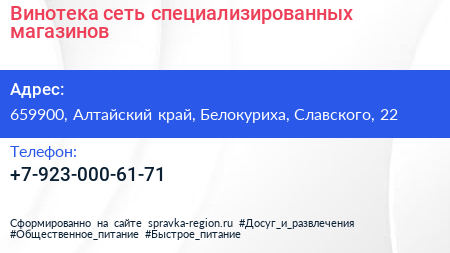 Винотека, сеть специализированных магазинов по адресу 659900, Алтайский край, Белокуриха, Славского, 22 в дальнейшем Организация, размещена в следующих категориях: