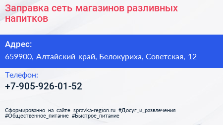 Заправка, сеть магазинов разливных напитков по адресу 659900, Алтайский край, Белокуриха, Советская, 12 в дальнейшем Организация, размещена в следующих категориях: