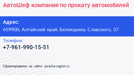 АвтоШеф, компания по прокату автомобилей по адресу 659900, Алтайский край, Белокуриха, Славского, 37 в дальнейшем Организация, размещена в следующих категориях: