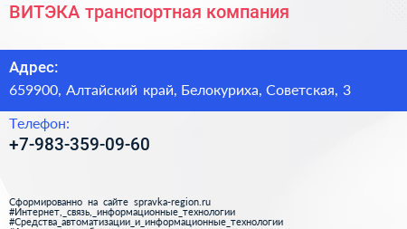 ВИТЭКА, транспортная компания по адресу 659900, Алтайский край, Белокуриха, Советская, 3 в дальнейшем Организация, размещена в следующих категориях: