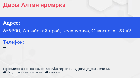 Дары Алтая, ярмарка по адресу 659900, Алтайский край, Белокуриха, Славского, 23 к2 в дальнейшем Организация, размещена в следующих категориях: