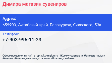 Димира, магазин сувениров по адресу 659900, Алтайский край, Белокуриха, Славского, 53а в дальнейшем Организация, размещена в следующих категориях: