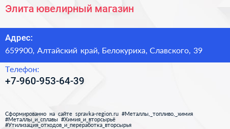 Элита, ювелирный магазин по адресу 659900, Алтайский край, Белокуриха, Славского, 39 в дальнейшем Организация, размещена в следующих категориях: