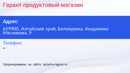 Гарант, продуктовый магазин по адресу 659900, Алтайский край, Белокуриха, Академика Мясникова, 9 в дальнейшем Организация, размещена в следующих категориях: