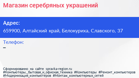 Магазин серебряных украшений по адресу 659900, Алтайский край, Белокуриха, Славского, 37 в дальнейшем Организация, размещена в следующих категориях: