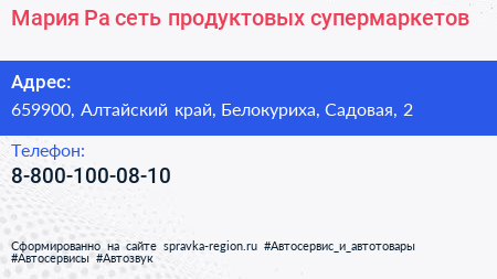 Мария-Ра, сеть продуктовых супермаркетов по адресу 659900, Алтайский край, Белокуриха, Садовая, 2 в дальнейшем Организация, размещена в следующих категориях: